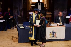 Student prize winners and honorary degree recipients were also presented. Honorary doctorates were awarded to, Mary Curnock Cook CBE, for extensive services to further and higher education; Mark Reynolds, Chairman and CEO of Mace, for innovative and responsible services to construction and the built environment; and Graham Watts, Chief Executive, Construction Industry Council, for extensive services to construction and a safer built environment. In receipt of an honorary MBA for his global impact in construction education was Fred Mills, Youtuber, and founder of B1M YouTube channel.